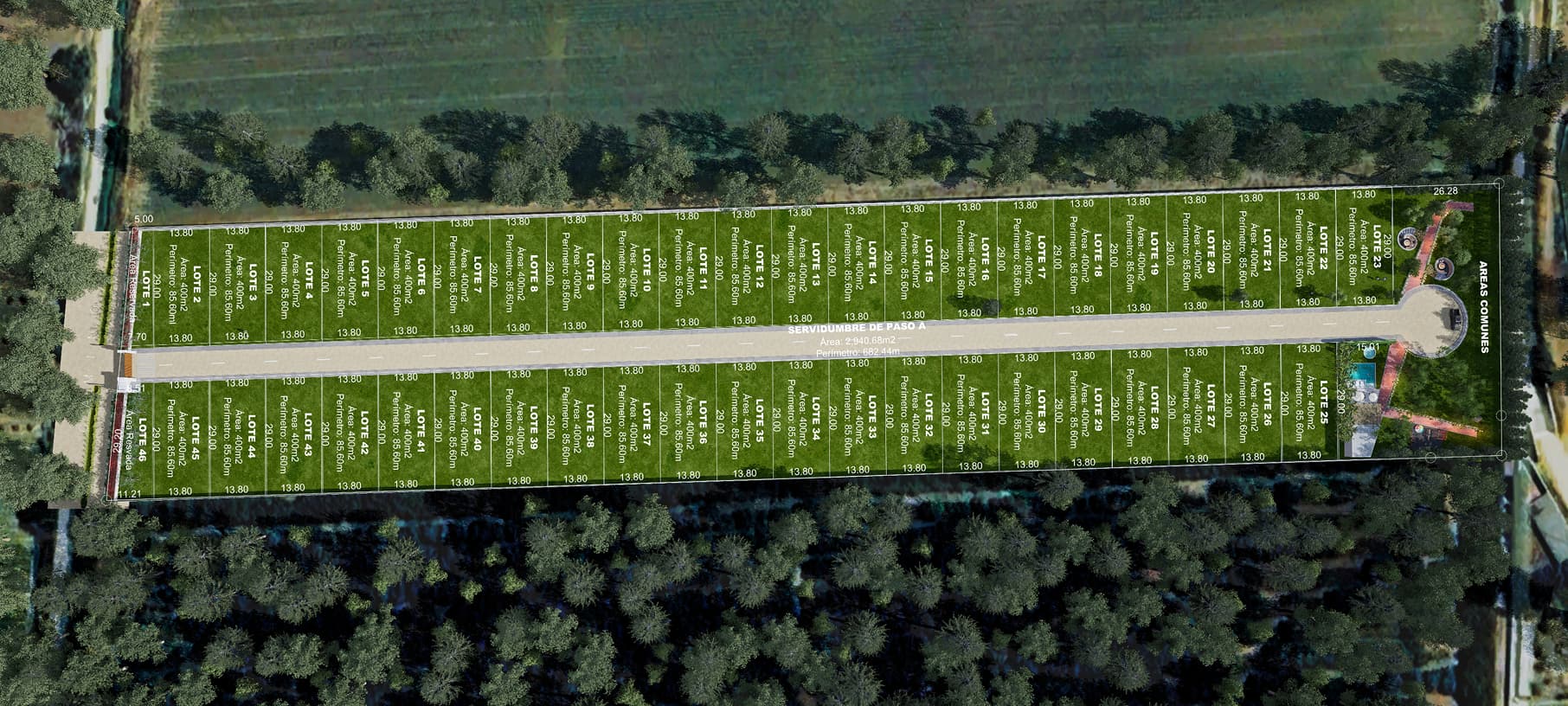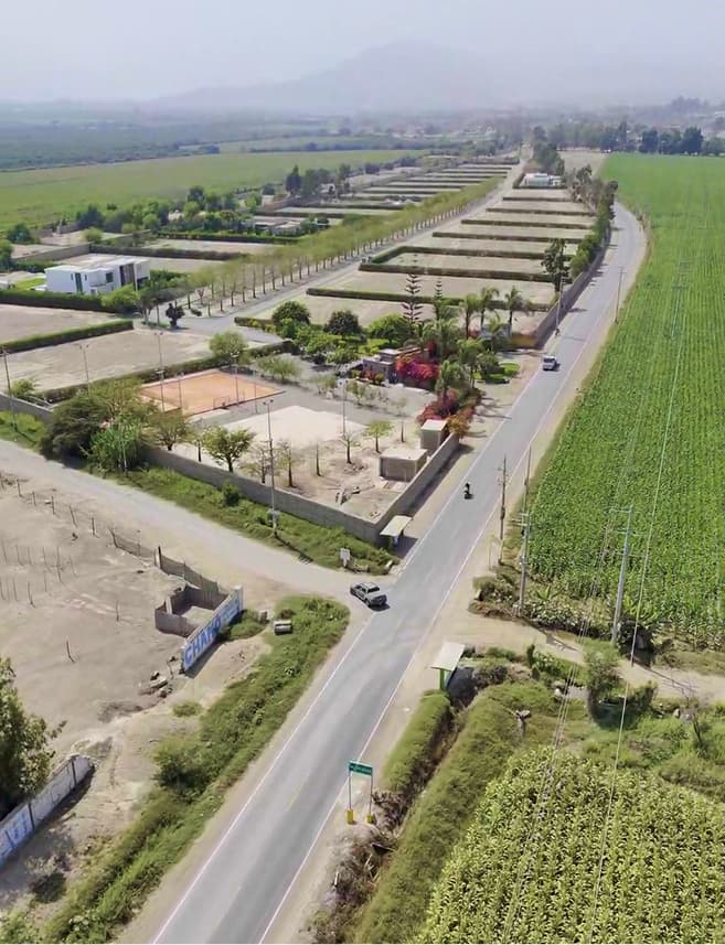 El Condominio cuenta con solo 43 lotes, todos tienen 400m2 de área y con medidas de 13.80m de frontis por 29.00m de fondo, ideales para construir una casa de campo amplia y cómoda.